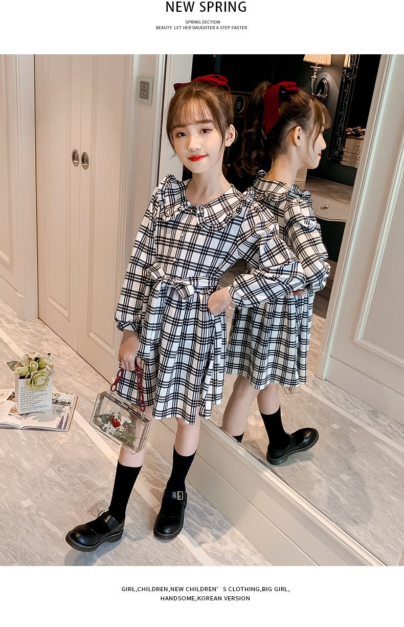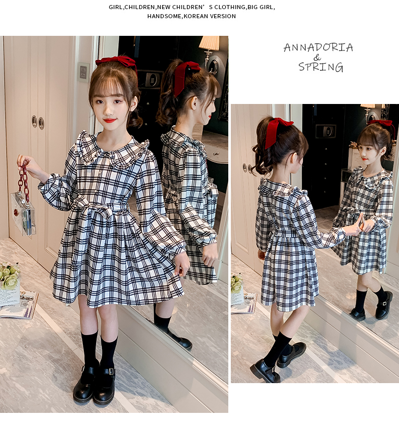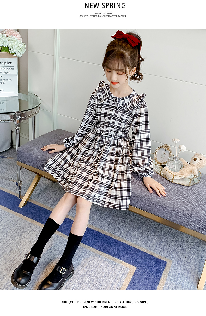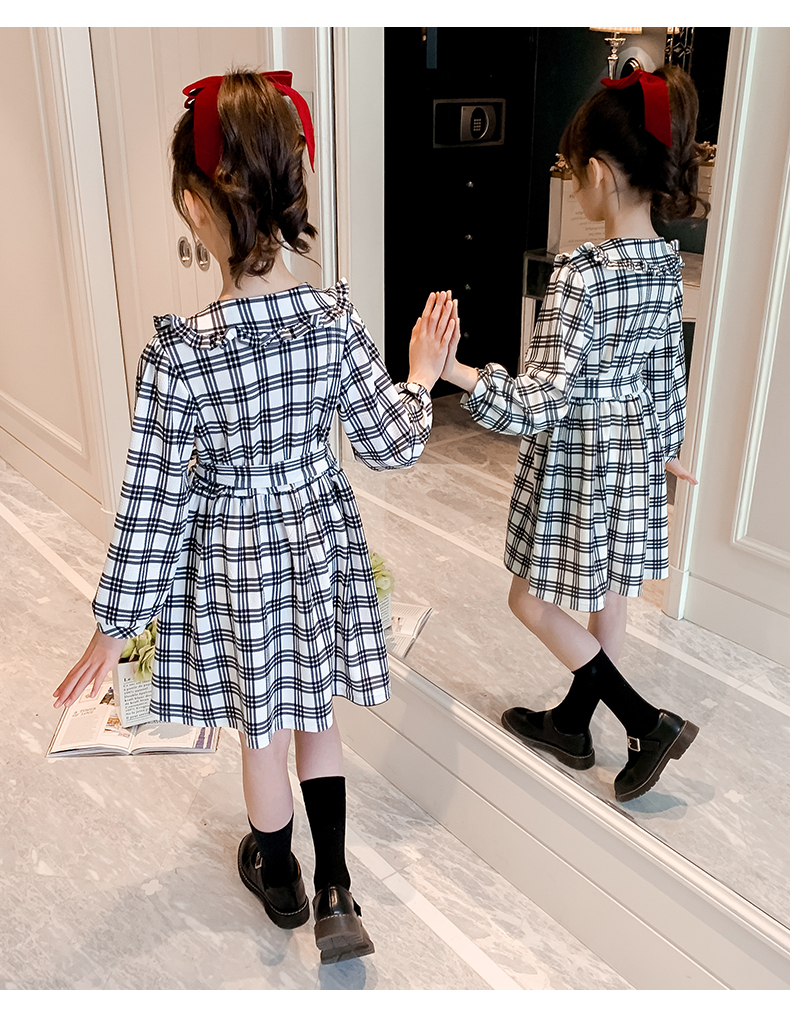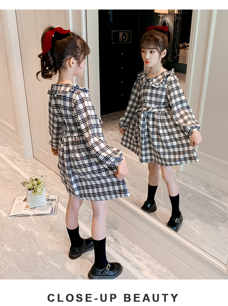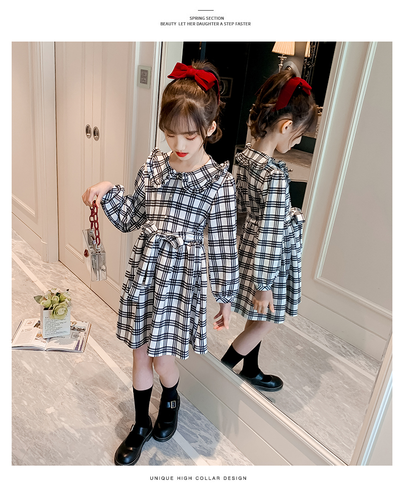 浪莎韓版女童花邊翻領(lǐng)黑白格子連衣裙2021春裝新款兒童長袖公主裙