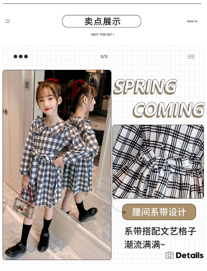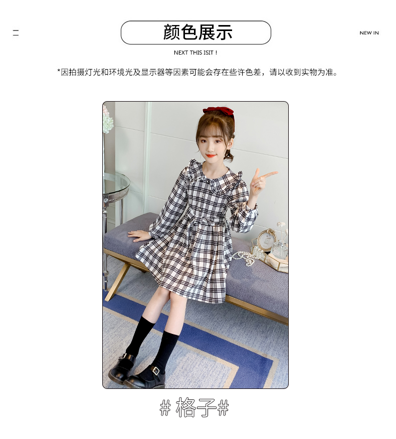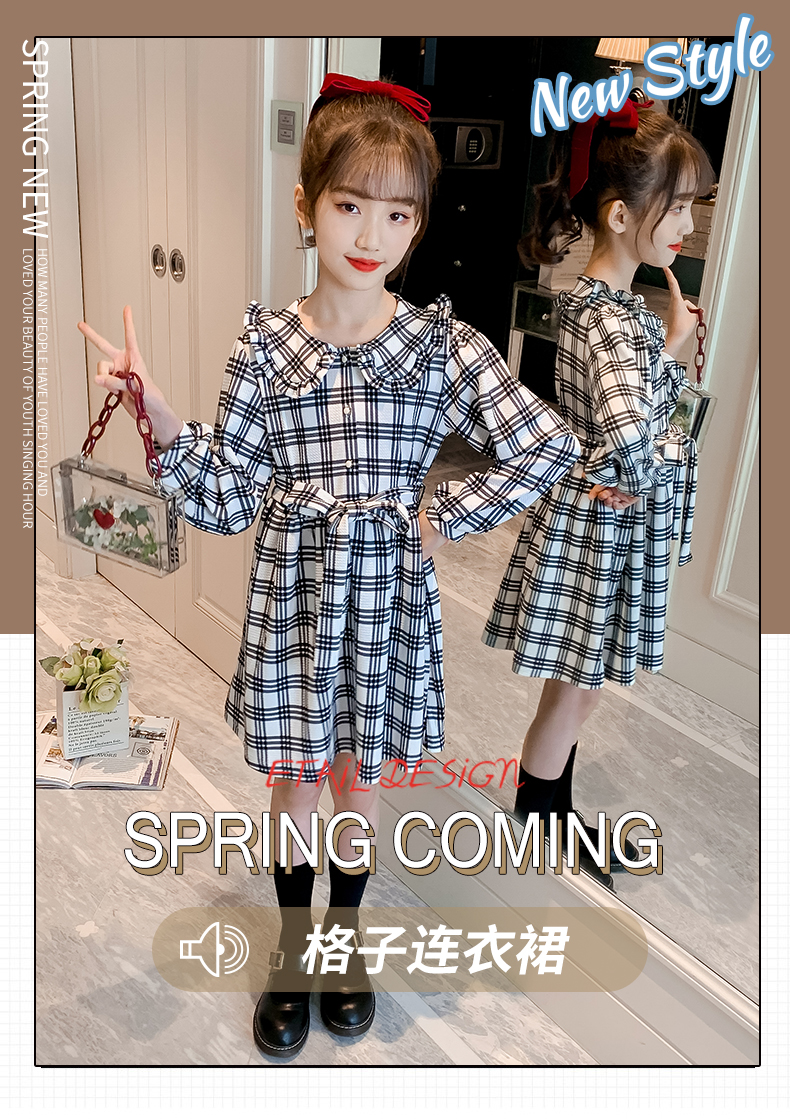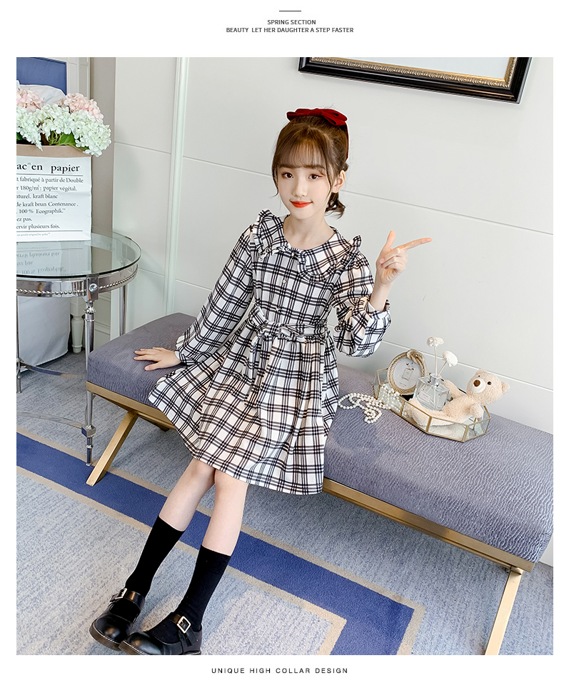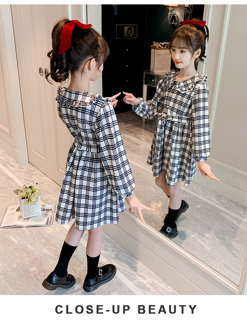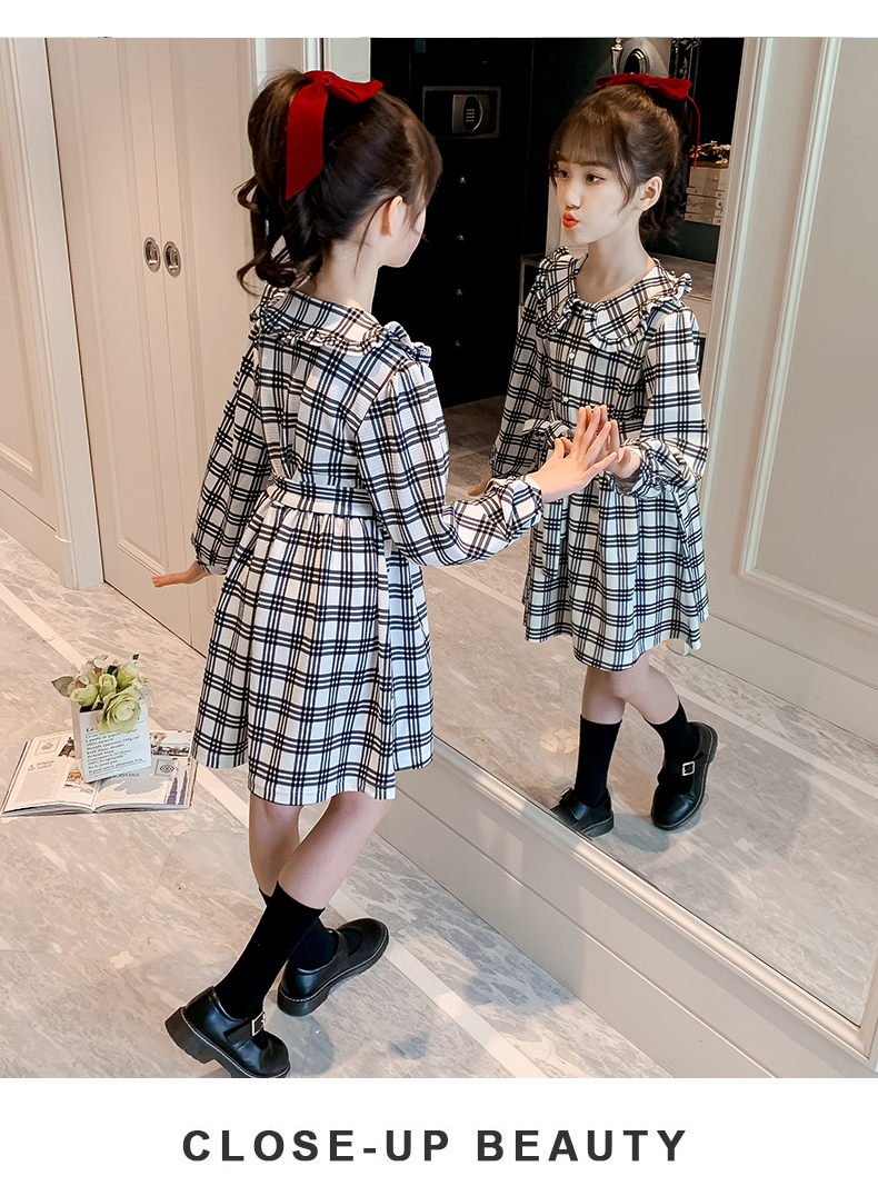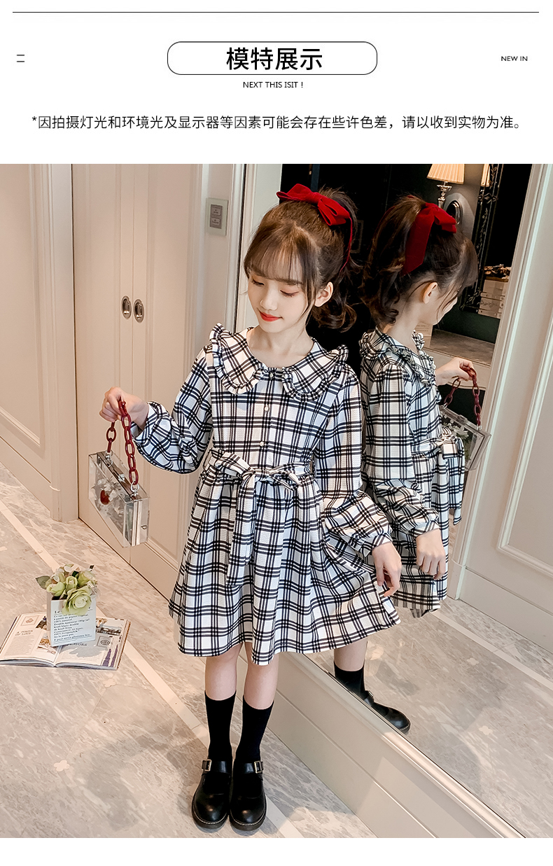 浪莎韓版女童花邊翻領(lǐng)黑白格子連衣裙2021春裝新款兒童長袖公主裙